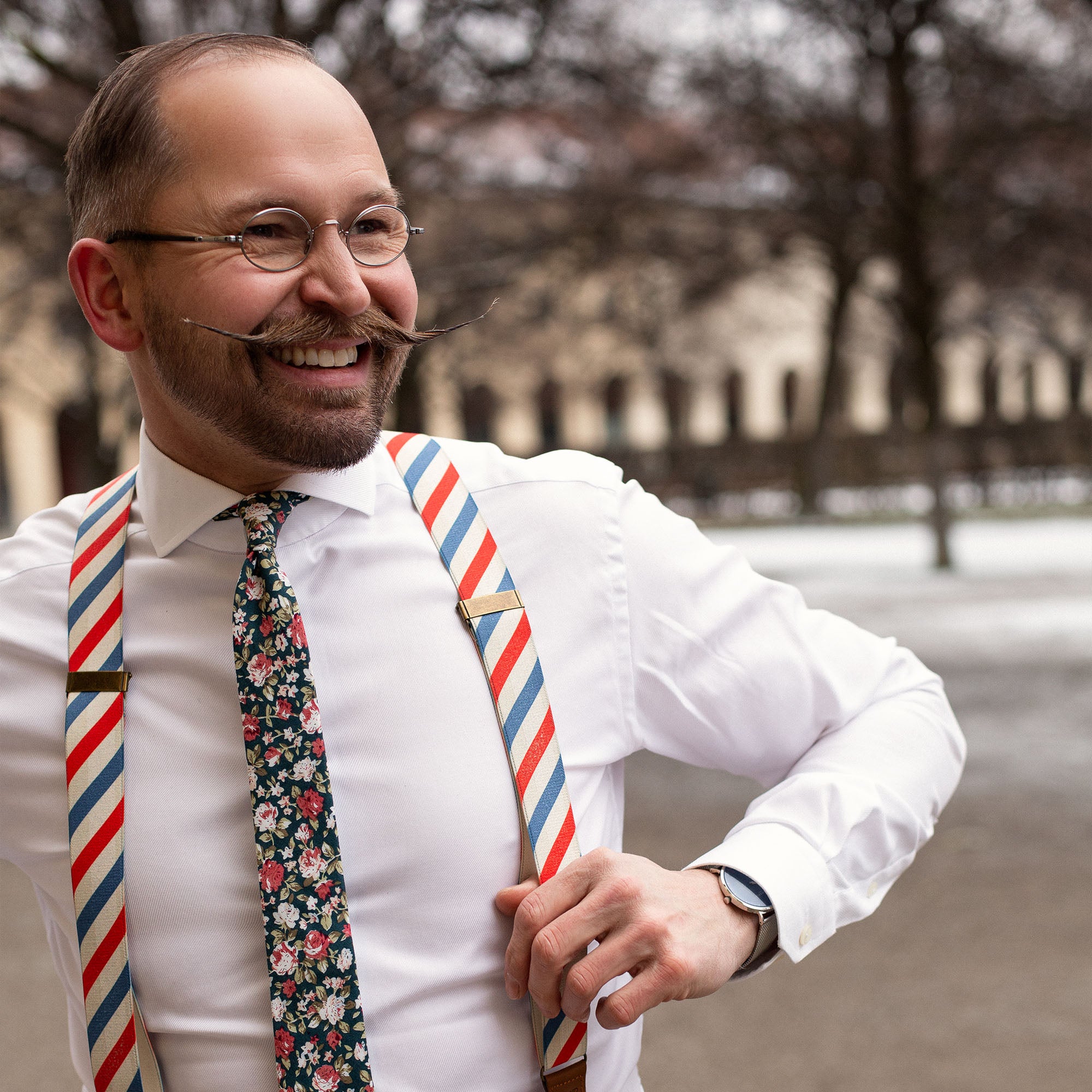 It is the Wiseguy Original Barber Pole Suspenders and they cannot be matched. I pair them with a white shirt, one of my high-waisted trousers, and a floral tie. I simply love it.